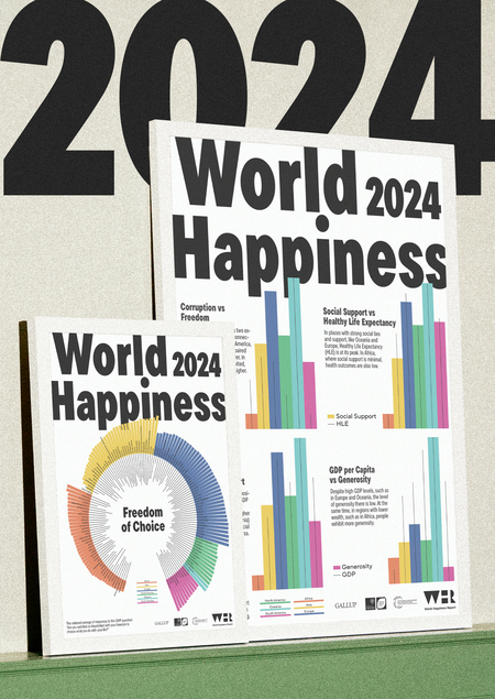 Серия плакатов 1 показывает уровень счастья всех стран, сортируя по континентам. Показано влияние других факторов на удовлетворённость жизнью.