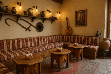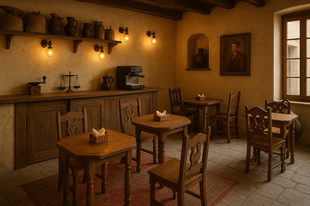 Prompt 1 A photorealistic interior of a cozy traditional Middle Eastern or rustic-style café or living room. The room features soft upholstered benches with oriental patterned fabric in burgundy and beige tones, low carved wooden tables, and a vintage Persian rug. On the wall hang antique items — a musical instrument (oud or mandolin), old tools, clay jugs, and copper pots. The ceiling is decorated with retro-style hanging lamps emitting warm light. Soft natural light flows through large wooden-framed windows. The atmosphere is warm, inviting, and slightly vintage with a touch of heritage. Horizontal photo, high detail, realistic lighting. 2 A photorealistic interior of a cozy rustic coffee shop with warm lighting and an old European charm. The room has stone walls and a tiled floor, wooden ceiling beams, and solid wood furniture — carved wooden chairs and tables. On the walls are vintage paintings and a wooden shelf with ceramic jugs, old scales, and burlap coffee sacks. A retro-style espresso machine sits on a wooden counter. Warm ambient light from exposed-bulb wall lamps mixes with soft daylight from a window. Horizontal composition, realistic lighting, inviting atmosphere.