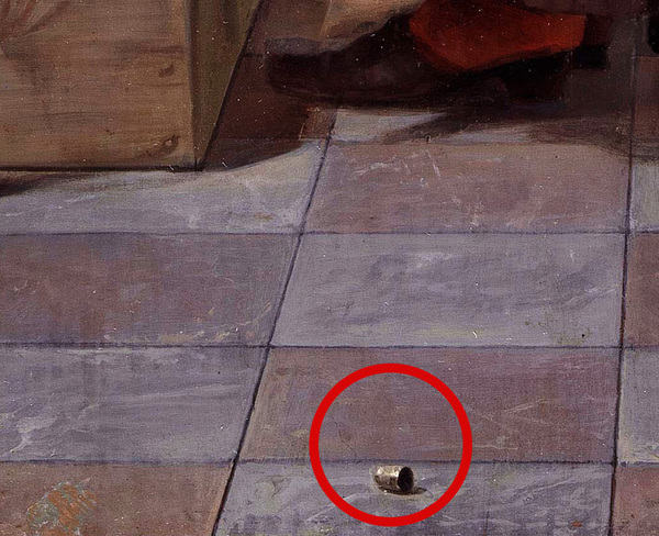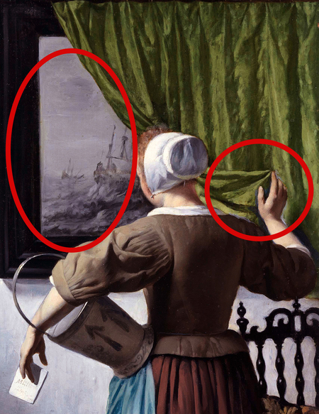 Детали — упавший наперсток и морской пейзаж за занавесом — намекают на сюжет картины.