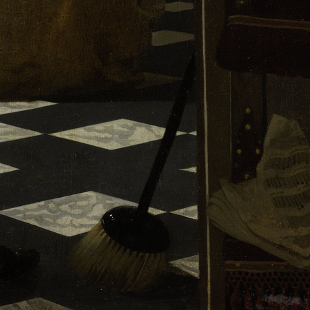 Габриель Метсю. «Женщина, читающая письмо». Фрагменты: упавший наперсток (слева) и служанка (справа) 1665