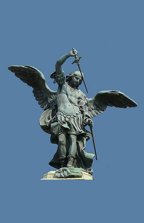 Ренессансная интерпретация Михаила в бронзе. Фигура классически пропорциональна, движение подчёркнуто развевающейся тканью плаща. Демон трансформирован в аллегорическое существо, над которым архангел торжествует. Позолота и полировка металла создают люксурный эффект