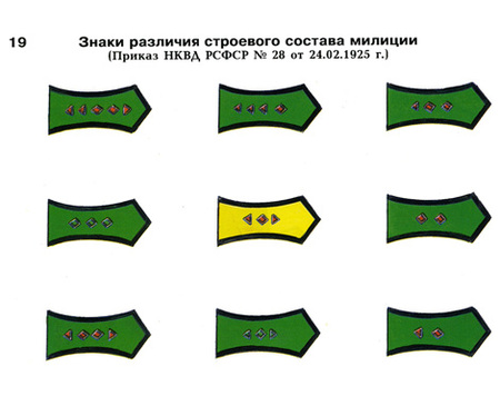Отличительные знаки сотрудников милиции. Слева — заведующие отделами Главмилиции, справа — начальник уездной милиции.