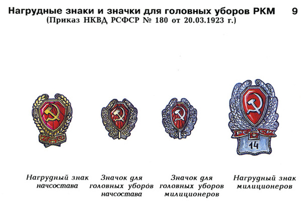 В 1920 году были утверждены отличительные знаки. На «Будёновках» нашивался краповый щит, на который крепился металлический значок. Этим же приказом вводятся нарукавные знаки в виде «Ромбов» и «Дисков», указывающие на должность сотрудника милиции.
