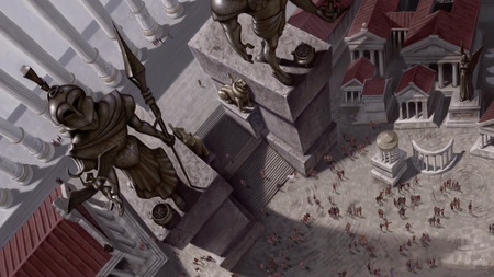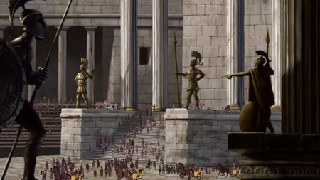 На нижних кадрах можно увидеть колонны, дополненные миниатюрными статуями. Однако подобное решение не было характерно для Древней Греции.