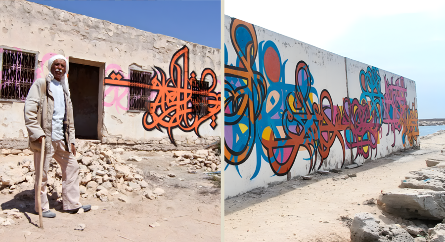 В проекте Lost Walls внимание eL Seed смещается от больших городских доминант к тому, что обычно остаётся на периферии взгляда. Вместо минаретов и магистралей он выбирает безымянные стены: обломки строений у трассы, глухие торцы домов в маленьких посёлках, забытые бетонные ограждения в ландшафте Туниса. За четыре недели поездки по стране в 2013 году он расписывает более двадцати таких поверхностей, превращая маршрут в цепочку точек, где каллиграфия неожиданно появляется там, где её никто не ждёт.