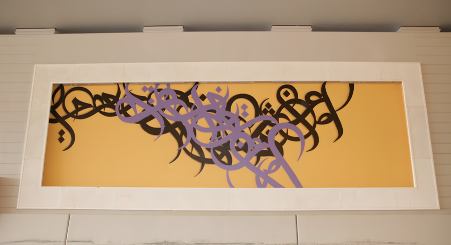 Возникает напряжение между регулярностью сетки и текучестью линии, напоминающее диалог куфи с дивани: строгий конструктивный каркас и свободное движение письма. Цветовое решение сдержанно: светлая вязь на более тёмном фоне подчёркивает силуэт букв и обеспечивает их читаемость на расстоянии.