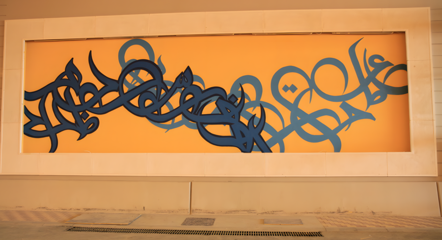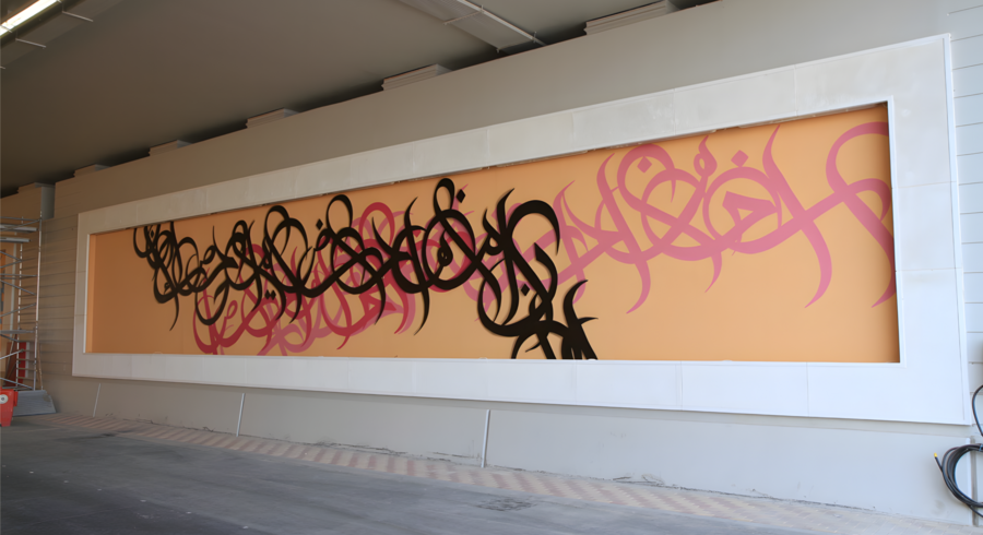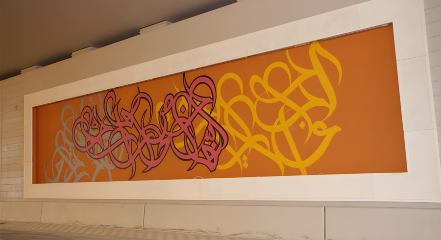 Масштаб букв рассчитан так, чтобы они оставались различимыми на высокой скорости, но при этом не дробили пространство на отдельные «плакаты» — зритель воспринимает их как одну длинную фразу, проходящую сквозь туннель. Цветовая система муралов опирается на оттенки, родственные пустынному ландшафту и архитектуре Дохи: песочно-бежевые, серые, приглушённые голубые и зелёные поля задают общий фон, на котором каллиграфические линии читаются ясно, но не агрессивно.