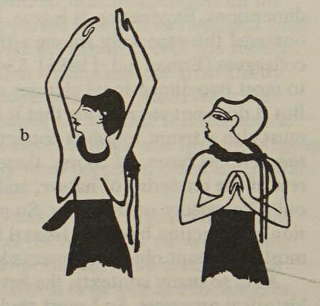 Руки. В состоянии покоя руки свободно свисают по обе стороны тела. Поскольку на рисунке руки свисают перед грудью и за спиной, их, конечно же, следует представлять как расположенными справа и слева, а также спереди и сзади, как грудь человека, носящего украшение. Хотя выступающая грудь на женских изображениях в этом отношении весьма проблематична, ей лишь изредка позволяют перекрывать руку.