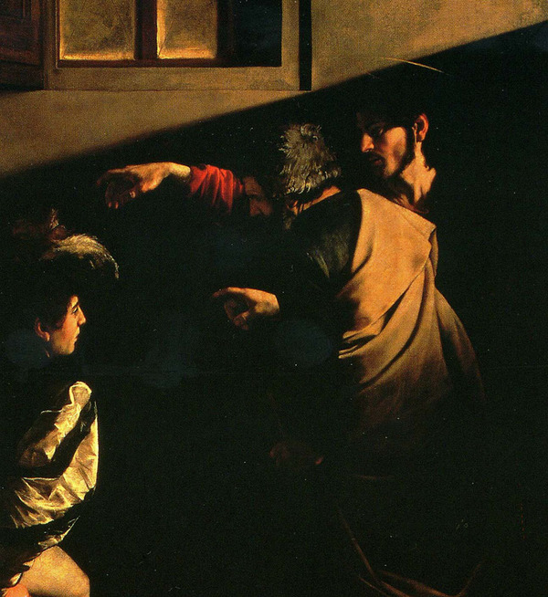 Самое ярое световое пятно на картине — это вытянутая рука Христа, которая указывает на Матфея. Голова же его также ярко освещена, в отличии от его туловища. Только тонкий нимб и лицо видны зрителю, благодаря этому создается одновременно скромный, но в тоже время величественный образ