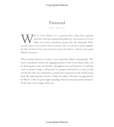 Редакторская логика Малуфа выстраивает Майер в традиции классической уличной фотографии, продолжая линию Анри Картье-Брессона, Гарри Виногранда и Роберта Франка. Здесь Майер — свидетель времени, «тихий наблюдатель», чья камера фиксирует мимолётные проявления человеческого существования. Таким образом, книга конструирует образ Майер как эмпатичного репортёра и летописца повседневности, почти полностью устраняя личностный и биографический контекст.