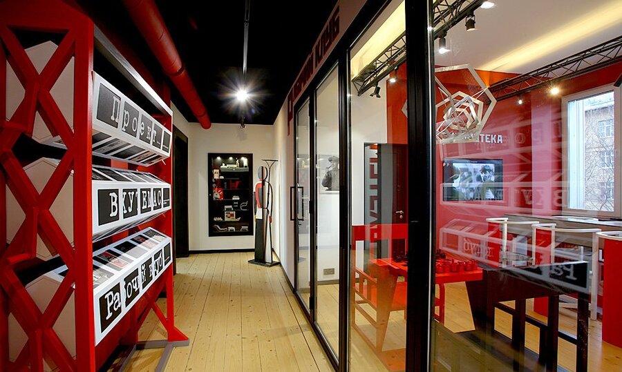 В клубе Родченко красные плоскости «собирают» в единое целое трибуну, светильник, стол, так мы буквально видим функциональное ядро пространства как единый красный контур.
