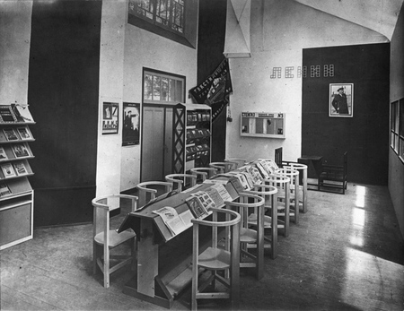 Для чтения имеется длинный стол-читальня с поворотной плоскостью, на которой можно менять угол наклона печатных материалов.