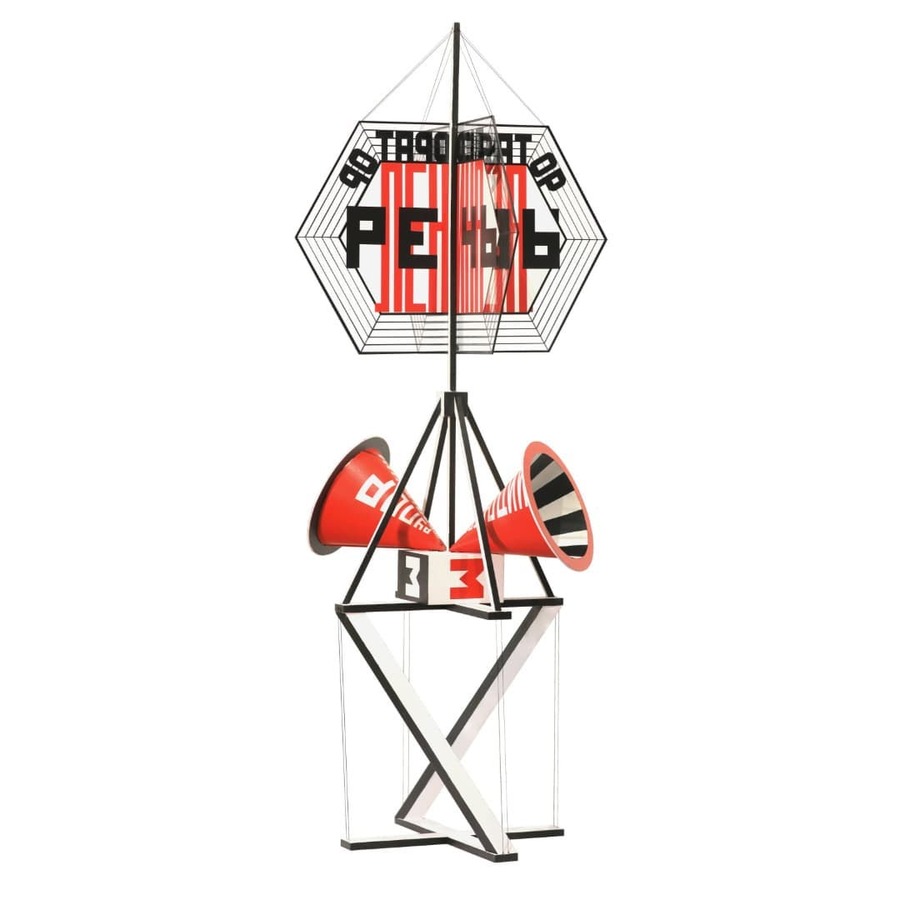 Конструкции Клуциса всегда подчеркнуто диагональны, в них нет спокойной симметрии. Опоры конструкции идут под углом, блоки информационных щитов выносятся вперёд и вверх, а мегафоны и стрелочные формы выстреливают в пространство. Композиция строится не на равновесии и симметрии, а на векторе воздействия: объект как стрела, направленная в толпу.