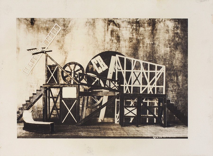 На сцене Мейерхольда обычные декорации исчезают. Вместо живописного фона здесь площадки, лестницы, мостики и колёса, которые действительно двигаются и включаются в игру.