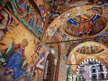 Архитектурные особенности: • Базилики и крестово-купольные храмы имели более простые формы по сравнению с византийскими аналогами. • В строительстве использовались кирпич и камень, а также применялась декоративная кладка. • Внутреннее убранство храмов украшалось фресками, например, в Рильском монастыре. • В архитектуре сохранялись элементы раннехристианского стиля, характерные для базилик.