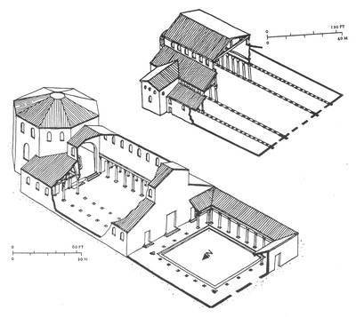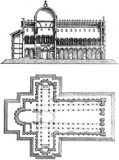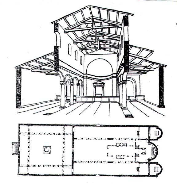 • Использование кирпича и камня. • Колонны с коринфскими капителями. • Центральный неф выше боковых, перекрыт деревянным или каменным сводом. • Апсида полукруглая, часто с мозаичным декором.