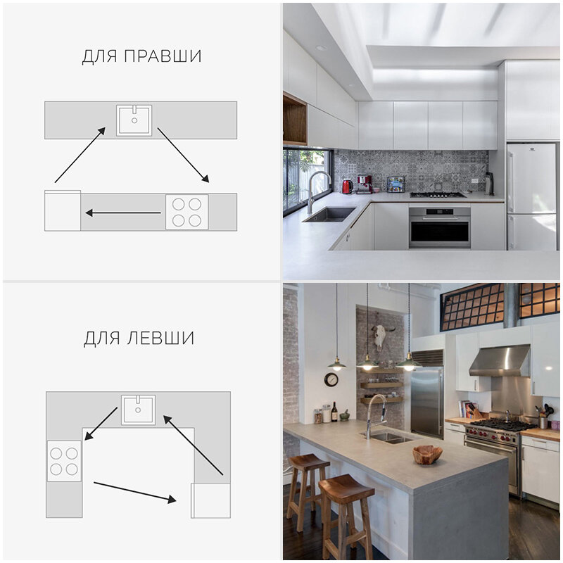 При планировании кухни для левши необходимо отталкиваться от зеркального расположения ее зон. Здесь важно понимать, что расположение хранения моющих средств у мойки следует делать слева, так же как и расположение посудомоечной машины (если для правши будет удобен правый верхний угол от раковины, то левше будет сподручнее ставить посуду в левый нижний угол). Расположение холодильника слева, так же как и левое открывание его дверцы больше подойдет для левши, так же, как и открывание ящиков. Также существуют нюансы по выбору приборов для кухни: некоторые ножи имеют ассиметричную заточку, и левша не сможет пользоваться такими. Если прихватку и чайник в мерными делениями без ориентации на руку можно с трудом найти, то мерные стаканчики с носиком и турки для кофе, к сожалению существуют только для правшей, здесь альтернативы нет.