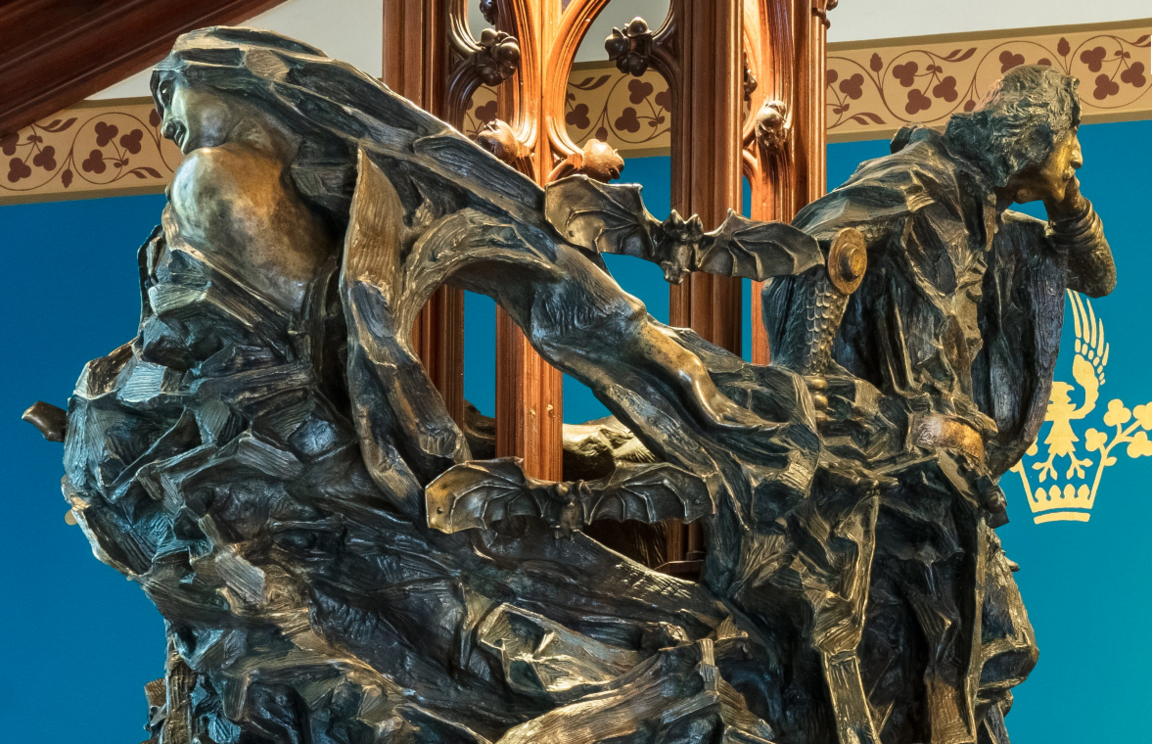 Для парадной лестницы Врубель создал скульптурную композицию «Роберт и монахини», вдохновленную оперой Мейербера «Роберт-Дьявол». Сюжет: рыцарь Роберт оказывается среди монахинь-призраков, пытающихся увести его в тёмное подземелье. Рядом с главным героем часто появляется загадочный Бертрам, который на самом деле является дьяволом и старается заманить юношу в ловушку.