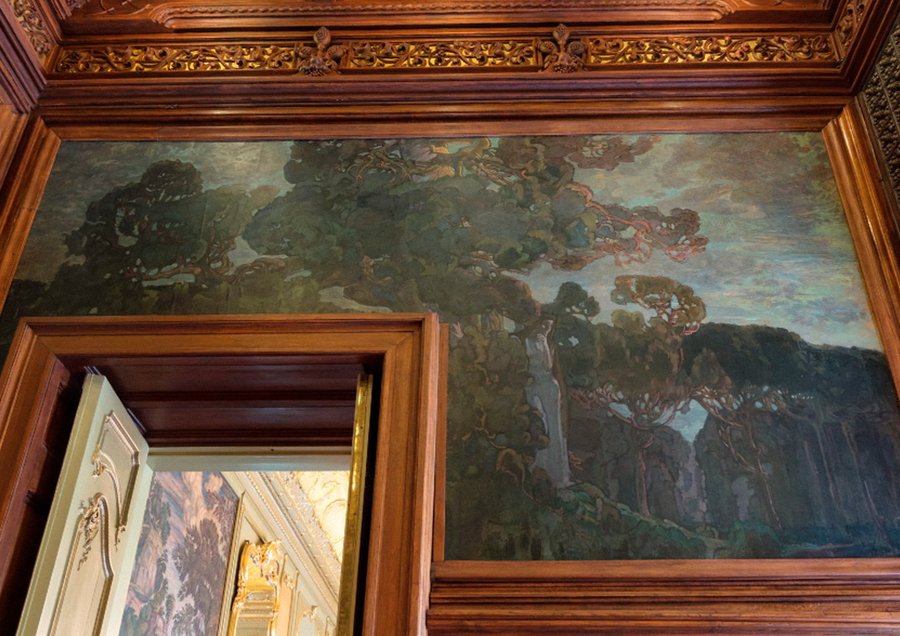 Панно Боннара для дома Морозова создают очень цельное впечатление, и особенно это заметно в пространстве парадной лестницы. Когда смотришь на интерьер, видно, что коллекционер заранее задумал украсить стены большими декоративными работами и тщательно готовил пространство под них. Художник получил точные размеры и фотографии, поэтому его композиции довольно естественно вписываются между пилястрами и продолжают архитектурный ритм.