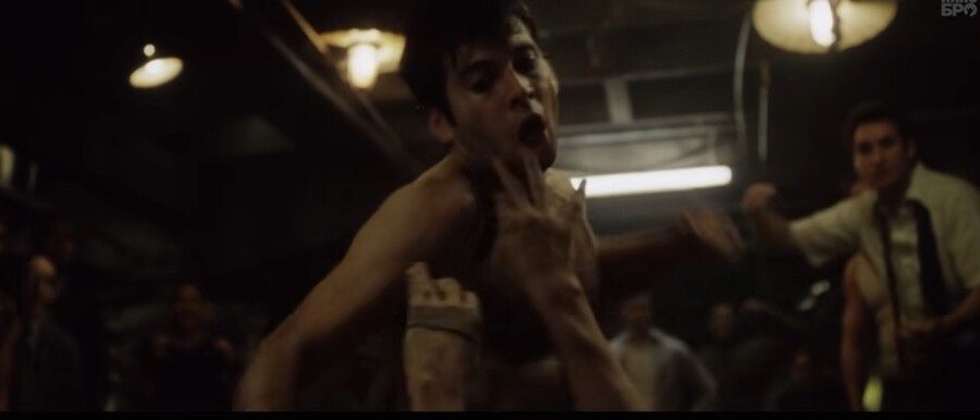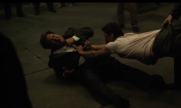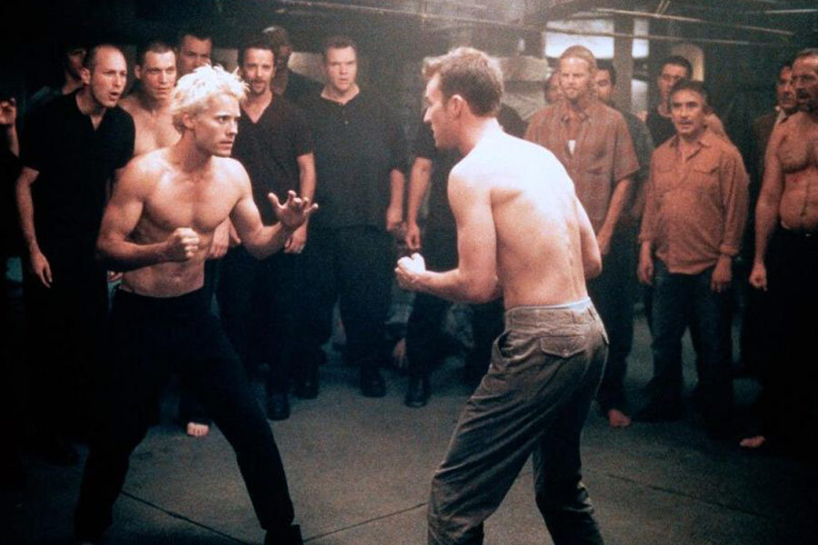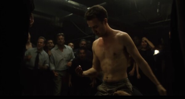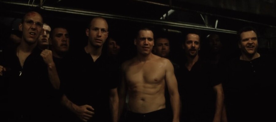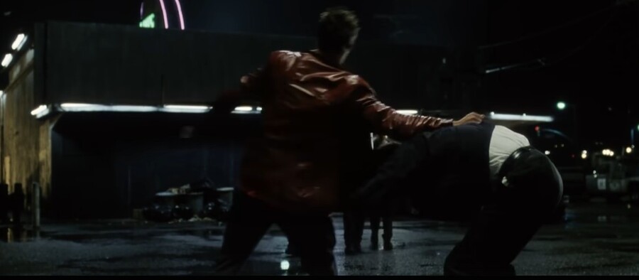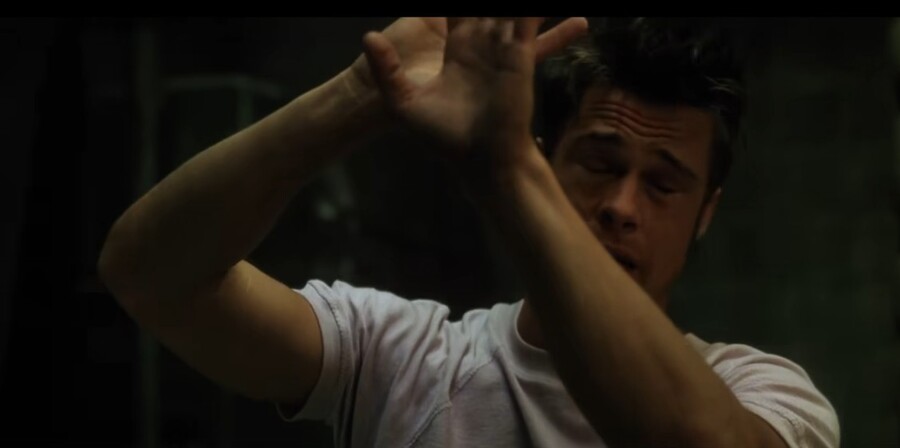 Кадры из фильма «Бойцовский клуб», 1999 г., реж. Дэвид Финчер (члены бойцовского клуба наблюдают за сценой насилия)