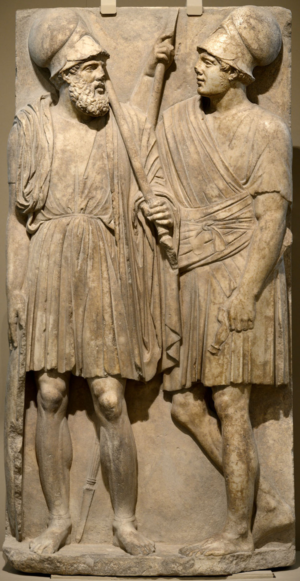 Стела с изображением двух воинов, 3-я четверть IV в. до н. э. // Сраженный воин из скульптурной группы восточного фронтона храма Афины Афайи на острове Эгина. 490-480 гг. до н. э.