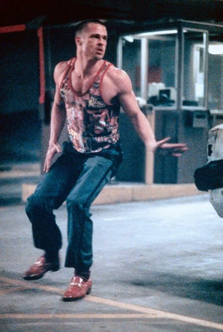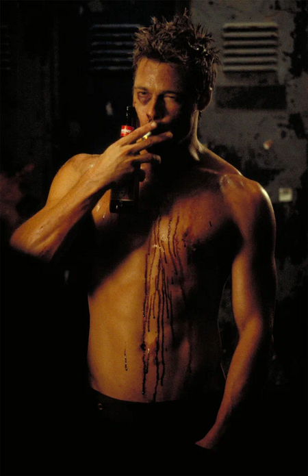В фильме Дэвида Финчера мужественность является агрессивным ответом кризису общества потребления [3]. Такие условия формируют характер маскулинных черт внешности: атлетичное телосложение имеет не столько эстетическое обоснование, сколько функциональное, т. е. обусловлено потребностью к применению насилия. Акцент делается на шрамах, синяках и крови, что подчеркивает брутальность и отказ от «стерильного» образа жизни.