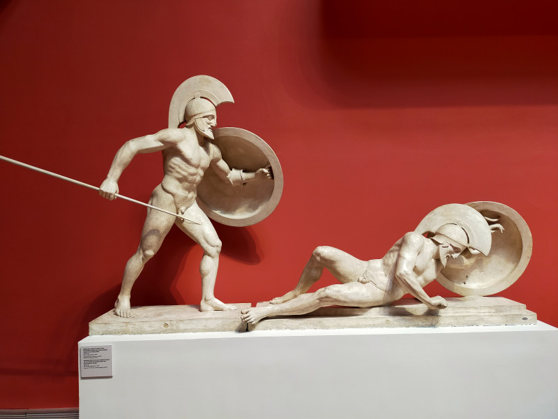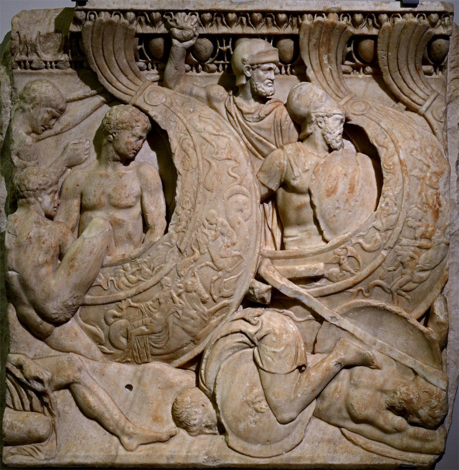 Фрагмент рельефа аттического саркофага со сценой морской битвы, Нач. III в. н. э. // Сражающийся воин (т. н. «Гладиатор Боргезе»), ок. 100 г. до н. э.