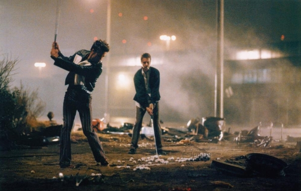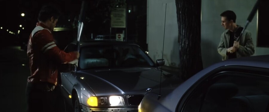 Кадры из фильма «Бойцовский клуб», 1999 г., реж. Дэвид Финчер (главные герои занимаются вандализмом)