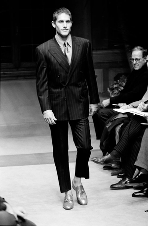 Именно в эти годы Giorgio Armani окончательно формирует эстетический канон мягкого, спокойного мужского костюма, где роскошь проявляется не в громкой декоративности, а в идеальной посадке, матовых тканях, нюансах цвета и почти архитектурных пропорциях. Многие коллекции Armani конца 1980-х и начала 1990-х стали визуальной библией для профессионалов: серые, графитовые, бежевые костюмы, мягкие плечи, элегантный драпинг, матовый твил, тонкие шерстяные смеси, минимальная фурнитура — всё это стало новой формой дорогого, взрослого мужского стиля.