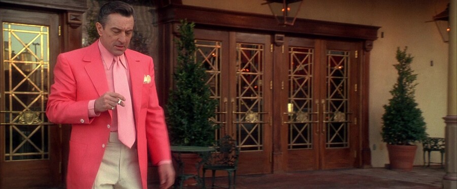 В фильме «Казино» Сэм Ротстин появляется в костюмах всех возможных цветов — от мятного и лимонного до кораллового и фуксия. Он — олицетворение мафиозного гламура. Его костюмы напоминают подиумные образы Versace 1991–1994 годов: насыщенные цвета, шёлковые рубашки, яркие галстуки, контрастные сочетания.