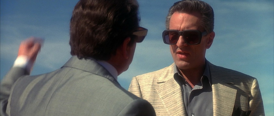 Например в «Короле комедии», герой Джерри Лэнгфорд появляется в костюмах с выраженными плечами и строгой геометрией. Его силуэт почти идеален для образца power dressing, предвосхищая стиль, который станет массовым к середине десятилетия. Широкая линия плеч показывает дистанцию между ним и ярким героем Де Ниро — она буквально «увеличивает» его власть.