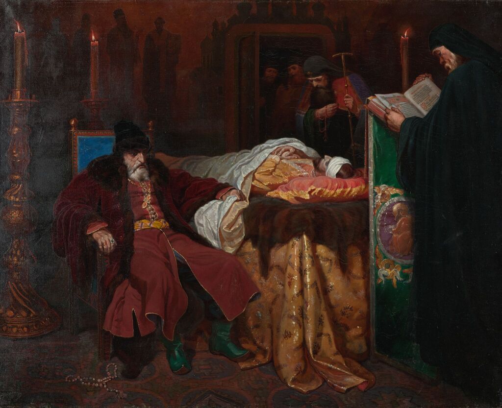 Тоска же Иоанна на полотне Вячеслава Шварца менее выражена. Грозный с таким же тяжелым и задумчивым взглядом сидит рядом с убитым сыном во время панихиды.