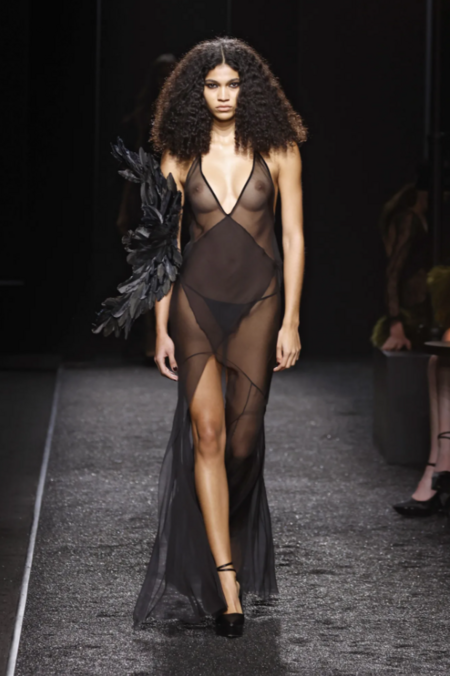 Сонтаг выступала за эстетику непосредственности, противостоящую слоям навязанных смыслов. Однако в контексте современной моды этот призыв к прозрачности обретает новый смысл. Если следовать логике Сонтаг буквально, прозрачная одежда должна была бы обнажать вещь как она есть, то есть тело. Но практика современных дизайнеров демонстрирует обратное. Многослойность прозрачных тканей создает не окно, сквозь которое видно тело, а сложную оптическую среду, новый объект.