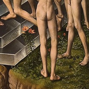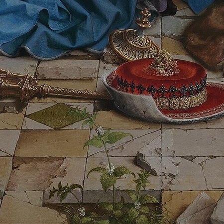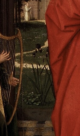 Благодаря этому маленькому мотиву ван Эйк подчёркивает, что сакральное открывается человеку не через величие или дистанцию, а через жесты, которые одновременно просты и наполнены глубоким смыслом.