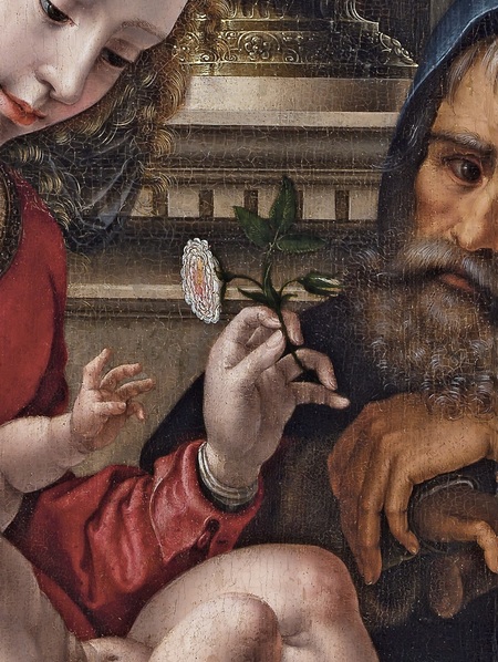 Цветок изображён осторожно: тонкие лепестки, простая форма, отсутствие нарочитой декоративности. Он напоминает маргаритку, и в живописи Северного Возрождения подобный мотив часто связан с чистотой и мягким характером Марии. Когда цветок находится в руке Богородицы, он работает как знак её смирения и кроткого отношения к миру. При этом жест Младенца делает растение частью взаимодействия между фигурами. Он будто пытается коснуться стебля, и сцена приобретает оттенок естественности, как будто речь идёт не о символе, а о бытовом моменте, который неожиданно оказывается значимым.