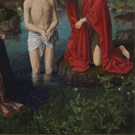 Давид показывает их так, словно копирует из натуры, но смысл в них выходит за пределы натурализма. Белые цветы рядом с Христом читаются как символ чистоты и новой жизни, подорожник традиционно связывают с целением, а это подходит к сюжету Крещения, где вода становится источником духовного исцеления. Самый факт того, что растения тянутся прямо к воде, создаёт ощущение движения к свету, будто они реагируют на священное действие.