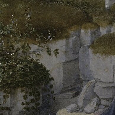 Одна из особенностей нидерландской традиции это желание показать природу в её реальном виде, без попыток сгладить несовершенства. Поэтому растения в картинах нередко выглядят неряшливо: сухие стебли, мох между камнями, сорняки у стен. Но именно в этом и заключается их задача. Такие детали напоминают, что священные сюжеты происходят в той же самой земной среде. Зритель не просто наблюдает сцену, он ощущает, что она происходит в настоящем, а не в абстрактном пространстве.