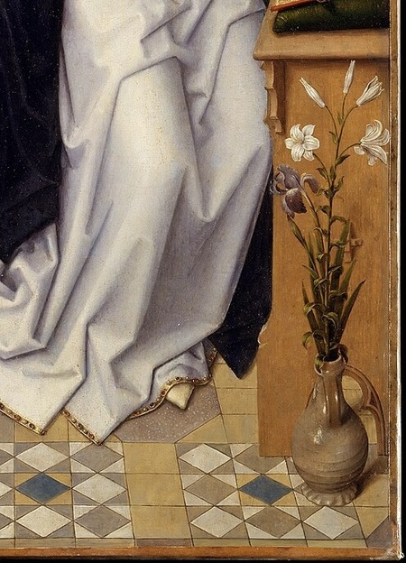 Художник помещает их в простой кувшин рядом с Марией, подчёркивая их связь с моментом явления ангела и рождением Слова. Лилии у Мемлинга выглядят не декоративно, а почти документально: каждая прожилка и каждый изгиб лепестков написаны с вниманием, характерным для нидерландской школы. Благодаря этому цветы превращаются в смысловой акцент, который подчеркивает чистоту, избранность и внутреннюю гармонию Мадонны. Мемлинг сознательно выделяет сосуд с лилиями на фоне пола и мебели, делая его оптической точкой, от которой взгляд снова возвращается к фигуре Марии.