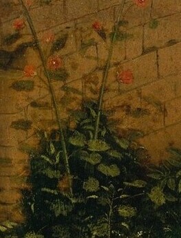 В «Благовещении» Петрюса Кристуса растение становится важным смысловым акцентом, вписанным в архитектурно строгую композицию. На переднем плане у садовой стены художник помещает высокую цветущую мальву, узнаваемую по тонким стеблям и красноватым соцветиям. Рядом виден другой белый цветок, вероятно лилия, традиционно связанная с чистотой Девы Марии. Эти растения образуют тихий, но выразительный контрапункт строгим линиям здания и торжественной фигуре архангела.