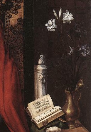 Белые лилии подчеркивают непорочность Марии и создают тонкую границу между бытовой обстановкой и духовным смыслом сцены. Их вертикальные стебли и прямые лепестки усиливают чувство строгой ясности, которое проходит через всю композицию. Цветы работают как небольшой, но важный акцент, который связывает образ Марии с идеей о чистоте и исполнении пророчества.