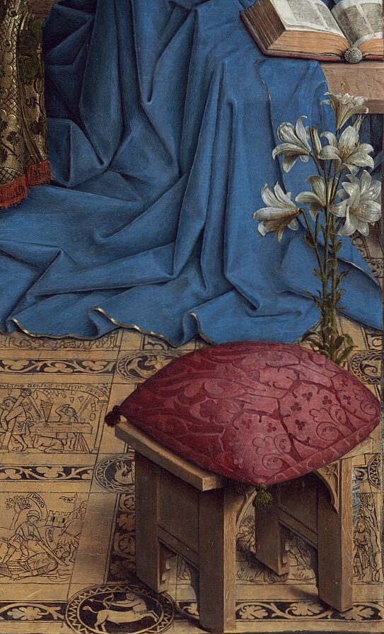 Ван Эйк строит сцену так, что пространство кажется почти осязаемым: строгие колонны, высокий свод, узкие цветные витражи. На этом фоне белые лилии у ног Марии выглядят особенно ярко. Цветы выписаны с удивительной точностью, и видно, что художник обращает внимание на их фактуру, мягкость лепестков и тонкие стебли. Они стоят отдельно, как самостоятельный объект, и именно поэтому сразу привлекают взгляд. Лилии будто смягчают строгость архитектуры и вводят более живой элемент в холодное пространство.
