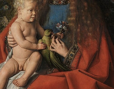 В композиции «Мадонна каноника ван дер Пале» цветы появляются в руках Младенца и становятся одним из самых тонких символических акцентов картины. Христос держит небольшой букет из гвоздик и незабудок, и этот жест задаёт интимный, почти камерный характер сцене. Гвоздика традиционно связывается со страстями Христовыми, так как её красные лепестки напоминают капли крови и будущую жертву. Незабудки ассоциируются с памятью и постоянством, поэтому их присутствие может трактоваться как напоминание о неразрывной связи Бога и человека, основанной на вере и верности. В руках Младенца этот скромный букет превращается в миниатюрное послание, заранее предвещающее и страдание, и любовь.
