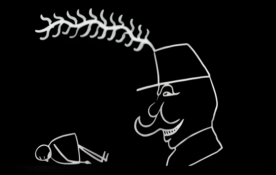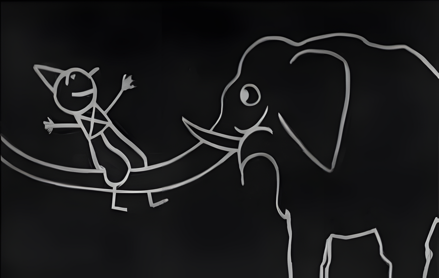 Несмотря на внешнюю схожесть трех персонажей, они раскрываются именно через разные реакции, мимику и манеру поведения. Контраст между героями усиливается фигурой волка — его гибкая, почти театральная пластика и более тёмный силуэт подчеркивают различие между героями.