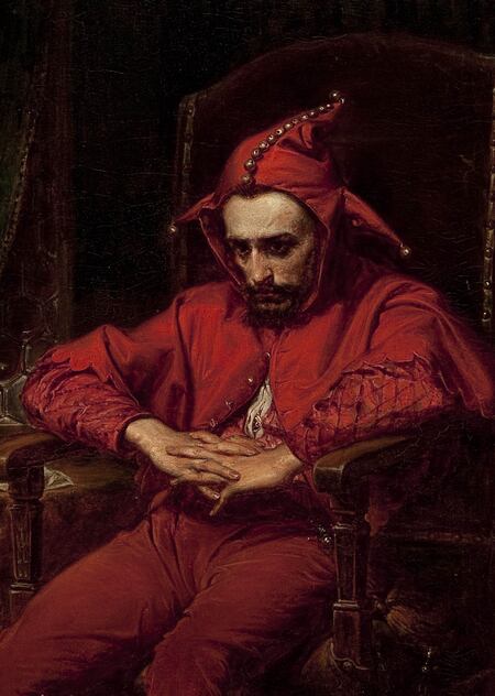 На столе рядом развёрнуто письмо — это известие о потере крепости, которое игнорирует двор, продолжающий пировать за занавесом. Брошенный на пол жезл шута и выглядывающий медальон Чёрной Мадонны на груди героя подчеркивают: он отказывается от своей маски весельчака и выступает как носитель национальной совести. Так комический персонаж по статусу у Матейко становится трагической фигурой, единственной, кто ясно видит катастрофу.