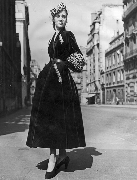 Одно из пальто Диора (из зеленого бархата, перетянутое в талии поясом) получило название «Князь Игорь»/Miss Dior dress, Haute Couture весна-лето 1949 г.