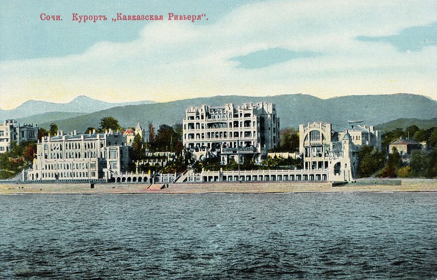 Открытка с изображением курортного комплекса «Кавказская Ривьера», Сочи, ранние 1900-е // «Кавказская Ривьера» в 2014 г.