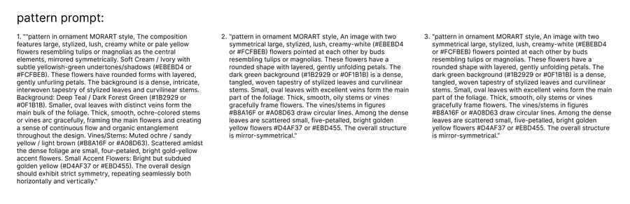 Меня завораживают орнаменты и паттерн, созданные Уильямом Моррисом, его стиль и движения «Искусства и Ремесла» остаются вечно актуальными символами витальности, природы и сложного ручного труда. Безусловно подобные орнаменты прекрасно смотрятся в интерьере и упаковке, однако создание новых паттернов в подобном стиле вручную требует колоссальных временных затрат. А современный дизайн (обои, текстиль, упаковка) нуждается в быстрой и вариативной адаптации классической эстетики. Поэтому я решила обучить нейросеть создавать паттерны вдохновленные работами Уильяма Морриса