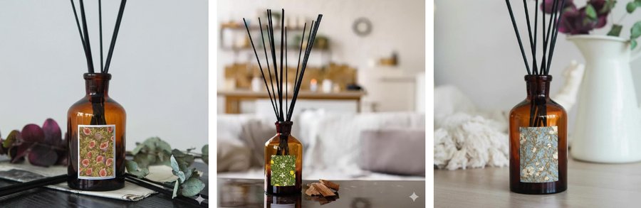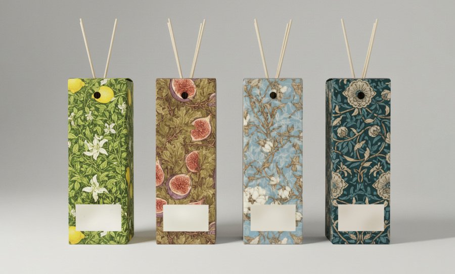 Я попросила нейросеть Gemini создать коробки с паттернами и пояснила, что это будут коробки для ароматических диффузоров. Нейросеть придумала забавную конструкцию с рожками-палочками и выдумала четвертый аромат