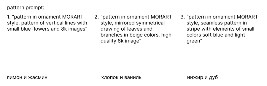 На практическом уровне модель доказала свою эффективность для различных задач дизайна. Для упаковки ароматических диффузоров были созданы тематические паттерны с элементами, соответствующими запахам (лимон, жасмин, дуб, инжир). В текстильном направлении удалось адаптировать стиль для постельного белья, используя параметр scale 0.5 для создания более сдержанных однородных композиций. Для интерьера модель генерировала крупномасштабные паттерны с хорошей читаемостью на расстоянии.