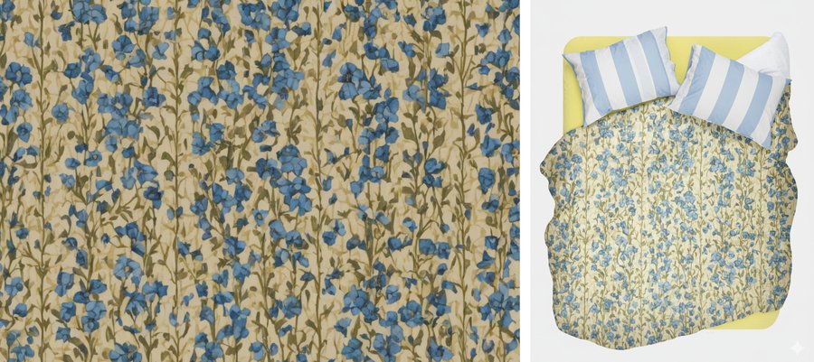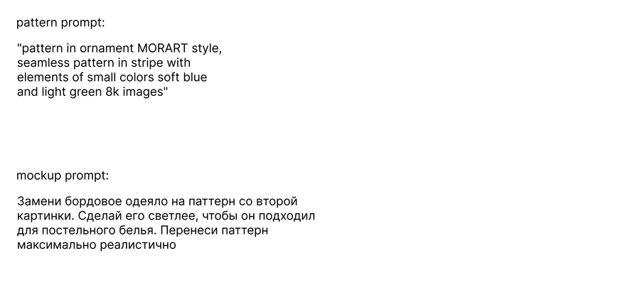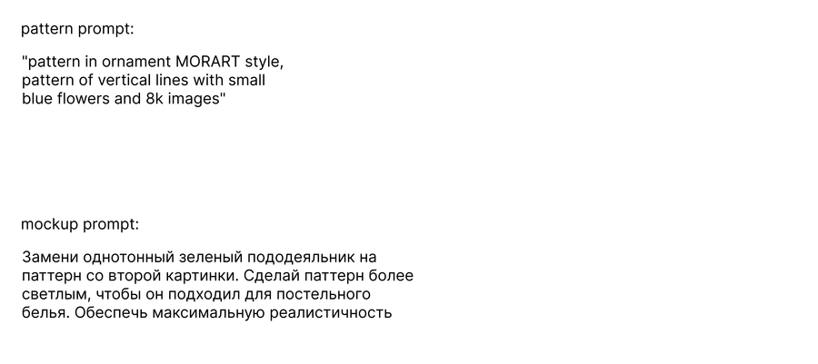После этого я приступила создавать паттерны для текстиля, а конкретнее — для постельного белья. Здесь, в отличие от предыдущей задачи, стояла цель сделать паттерн наиболее однородным, но все еще интересным и затейливым. Мне не нужны были выделяющиеся по массе объекты: фрукты, цветы, птицы и т. д. Скорее, паттерн для постельного белья напоминает однотонный узор. Чтобы поэкспериментировать с результатом, я попробовала изменить «силу» стиля обученной нейросети и сменила его, добавив строчку в код: cross_attention_kwargs={"scale»: 0.5}